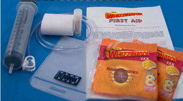 The Personal Integrated Squeeze System Offering Faster Flow-rates or P.I.S.S. O.F.F. for short. All of the fake piss in the reservoir bag is firmly and safely squeezed out. This results in a longer, more powerful stream.